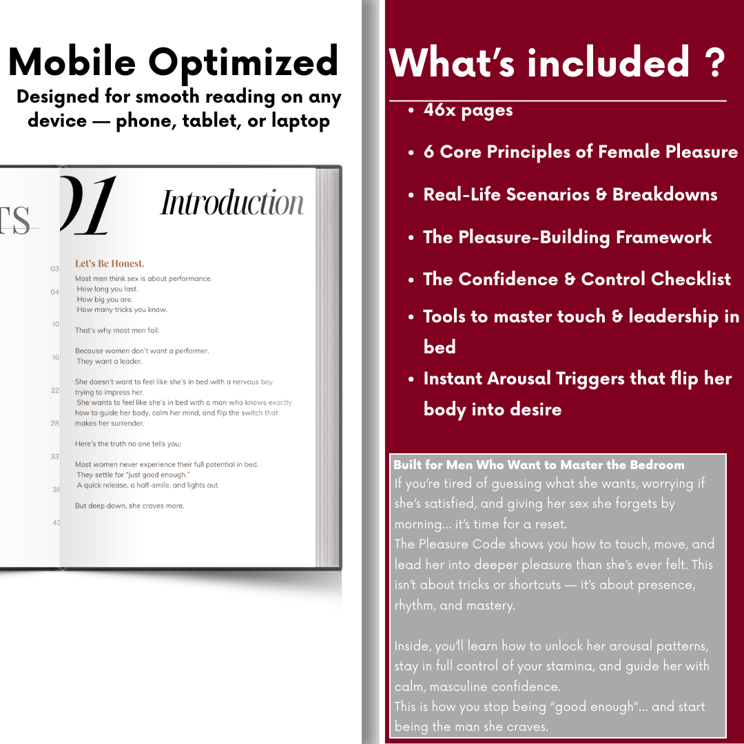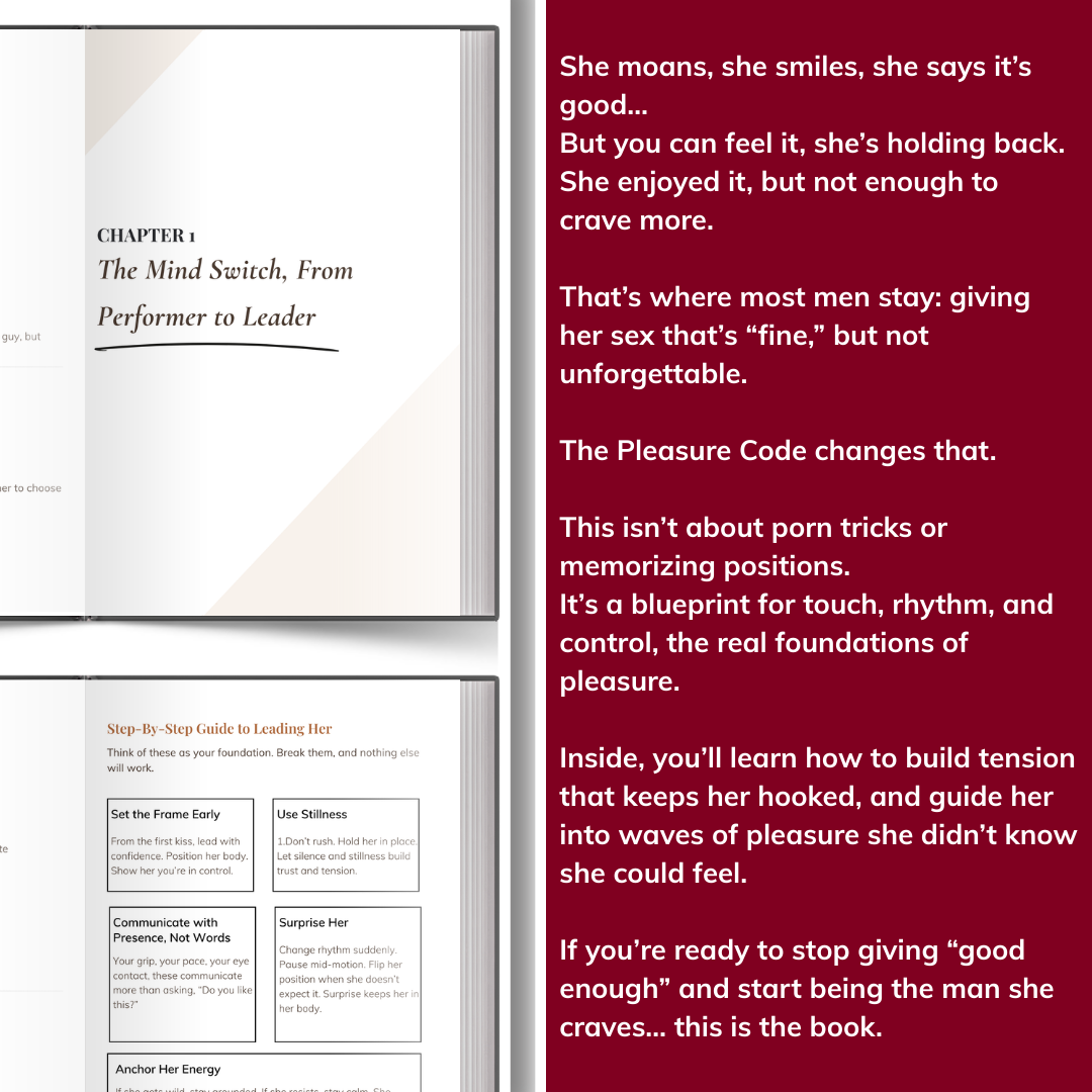 The Pleasure Code gives you what most men never learn, how to touch, move, and lead her body into maximum pleasure.